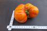 Rot mit schönen gelben Streifen und sie ist eine leicht abgeflachte runde Fleischtomate von 180g bis 300 g.