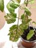 Edit: Die Pflanze im Hintergrund wurde gekauft, nachdem die selbst gezogenen (wie die im Vordergrund) Probleme bekommen haben. Die Löcher in den Blättern sehen nach Transportschaden aus. Edit2: Wie ich gerade erfahren habe, sind die betreffenden Pflanzen von 2) inzwischen entsorgt, hier kann ich leider keine Detailaufnahme mehr nachliefern.