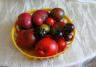 In dem Korb sind zwei Northern Lights, eine Pierce's Pride, eine Noire Cosebeuf, ein roter Kürbis, eine Midnight in Moscow, vier Scabitha, eine Orange Fleshed Purple Smudge und eine Perzevidnij